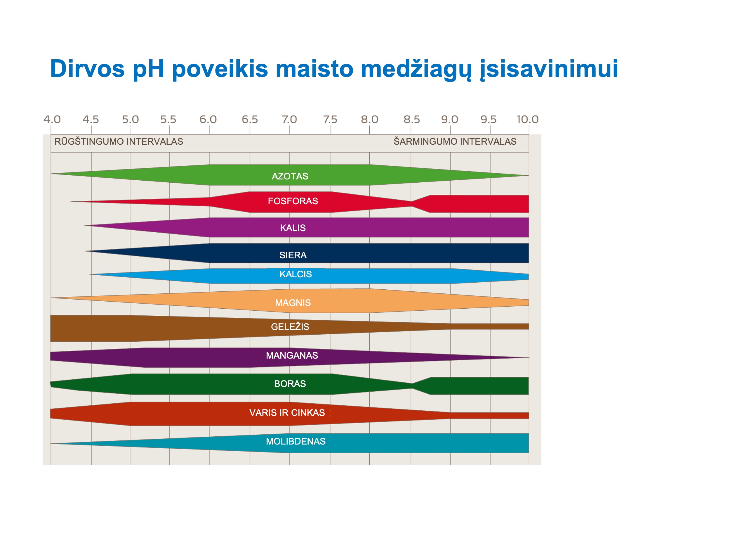 Ir priešingai, pH šaknų lygyje pakilus virš 7,0, tokios maisto medžiagos kaip fosforas (P), manganas (Mn), cinkas (Zn), varis (Cu) ir geležis (Fe) tampa mažiau įsisavinami.