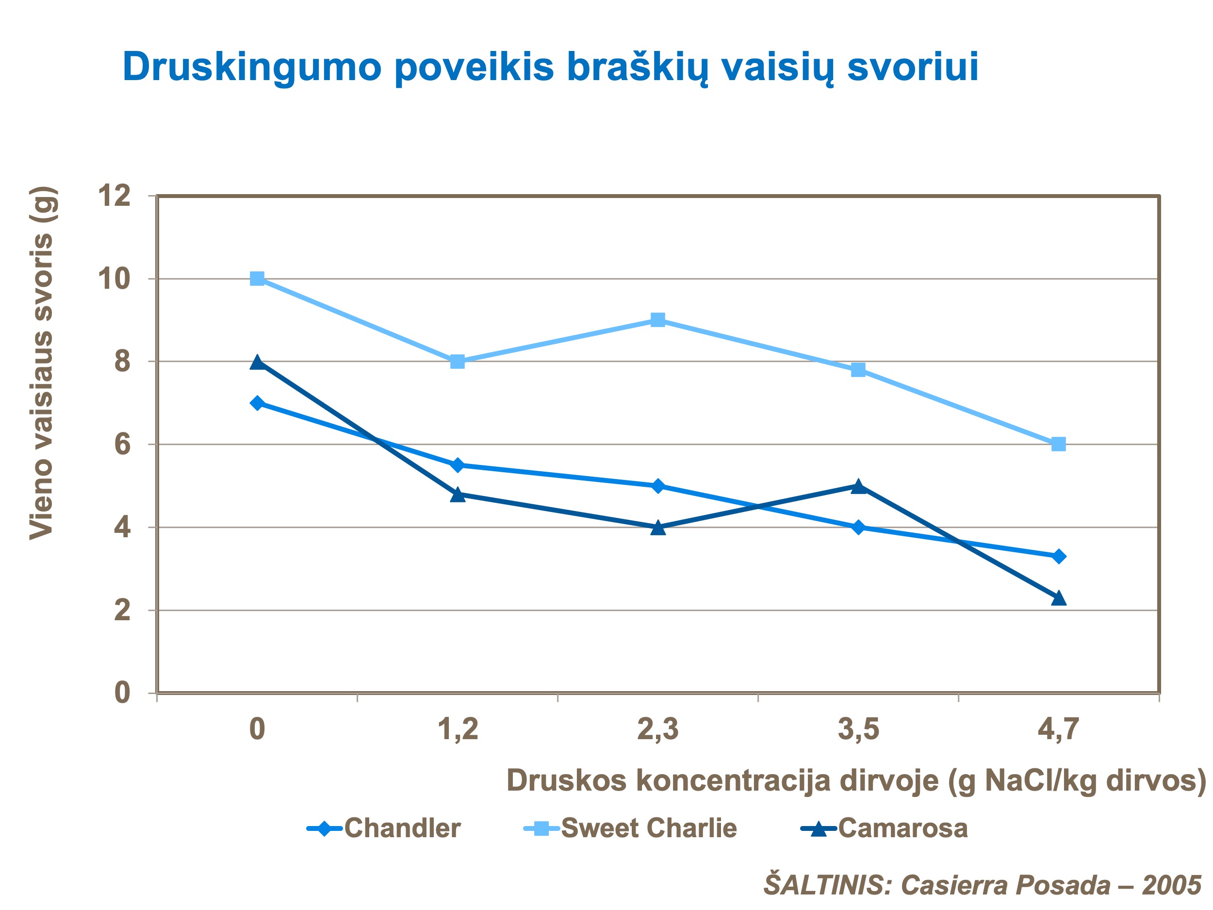 Čia Y yra santykinis augalų derlingumas (%), ECe yra vandens prisotinto dirvožemio ištraukos druskingumas, matuojamas dS/m, a yra didžiausia 100 % augimo ribinė vertė, o b yra derliaus nuostolis padidėjusio druskingumo matavimo vienete. Braškėms: a = 0,7, o b = 33,3, todėl visa lygtis yra tokia: