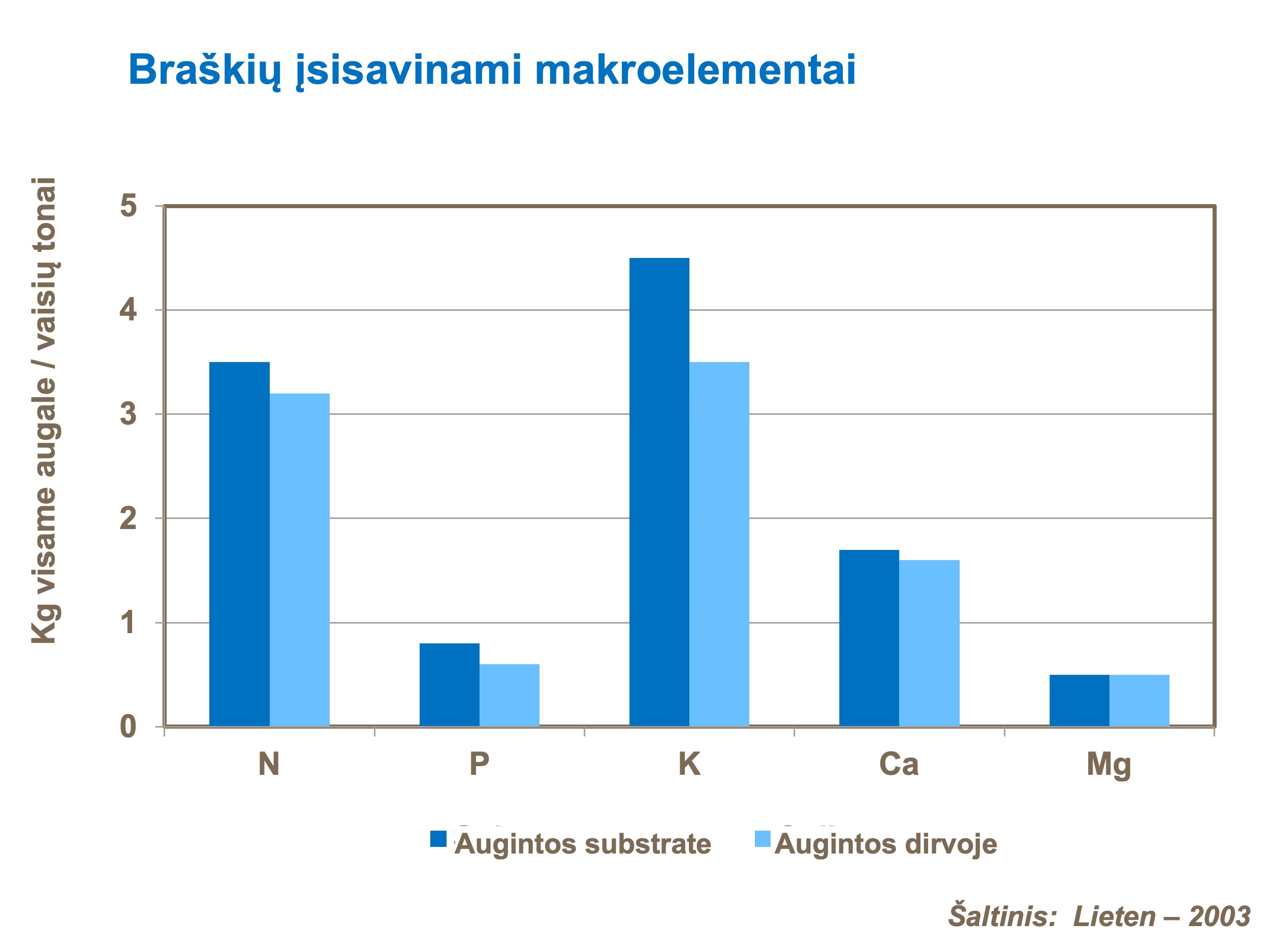 Įsisavinimo duomenys patvirtina, kad vienai tonai uogų reikia apie 3–3,5 kg azoto.