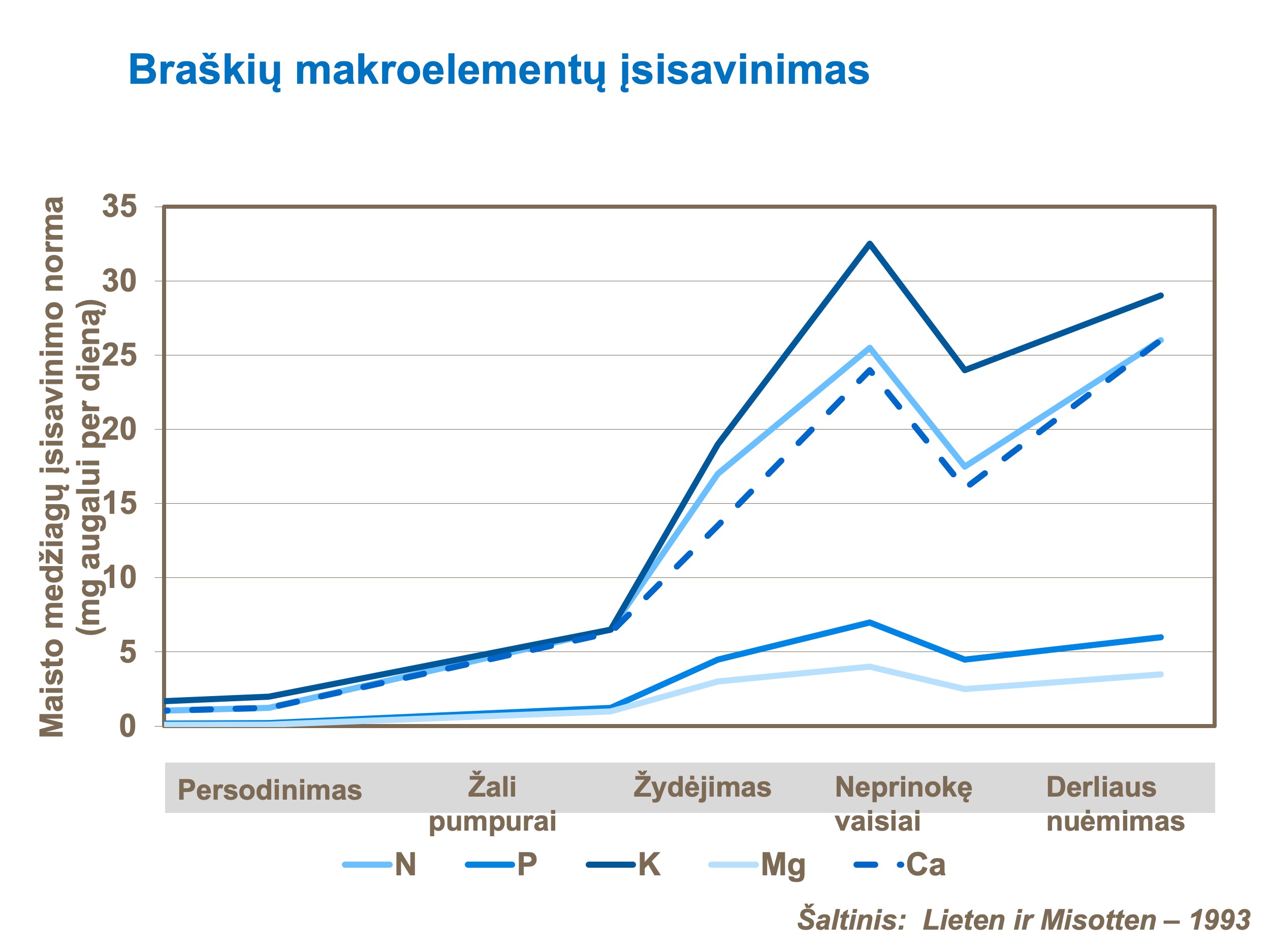 Azoto įsisavinimas padidėja vegetaciniame etape, o aukščiausią lygį pasiekia prieš pat pradedant nokti uogoms.