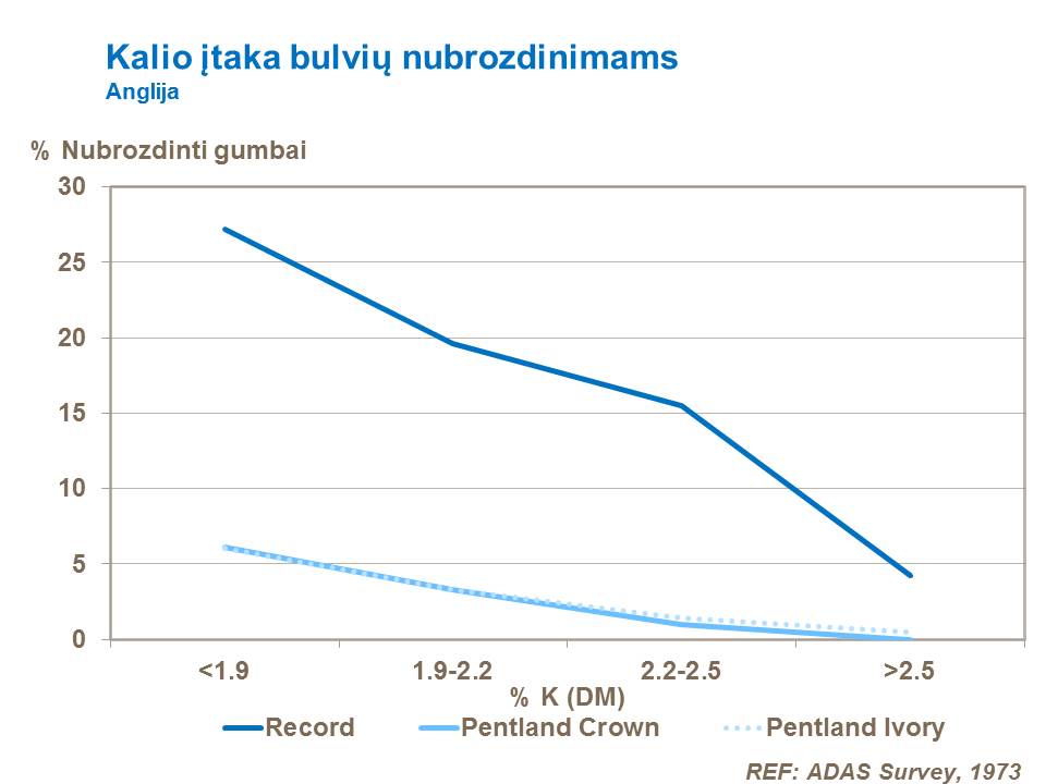 Šių, Anglijoje atliktų bandymų rezultatai rodo sąryšį tarp kalio kiekio ir gumbų numbrozdinimo rizikos lygio, taip pat poveikio lygį pagal bulvių veisles.