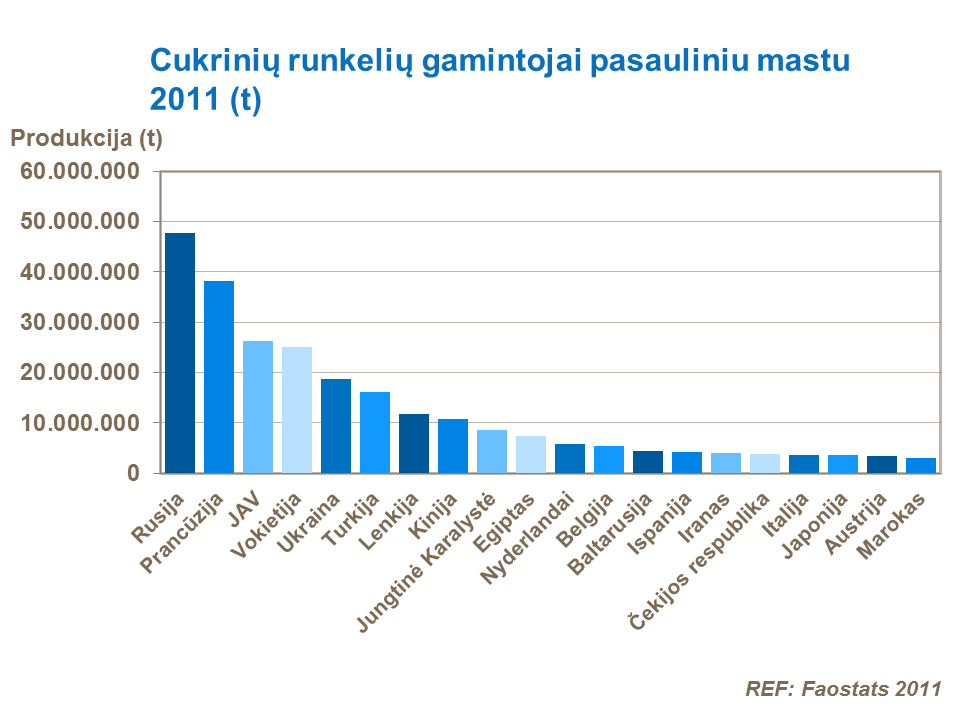 Didžiausi cukrinių runkelių produkcijos gamintojai, vertinant tonomis, yra Rusija, Prancūzija ir JAV.