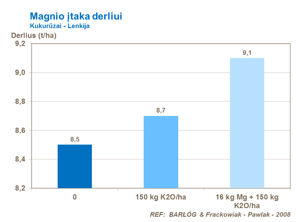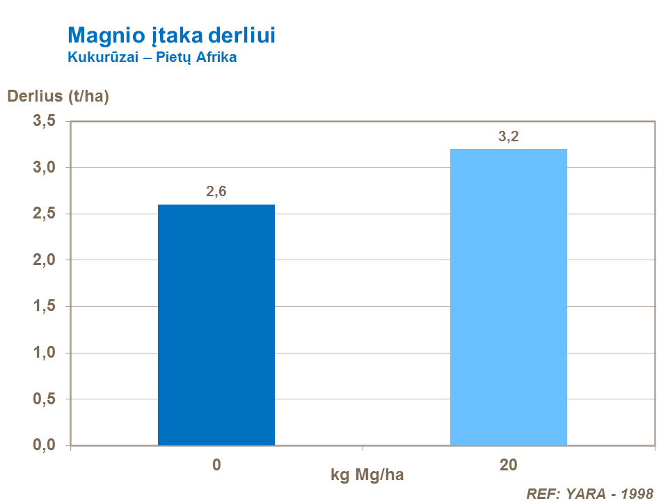 Didžiausias magnio poreikis augalams pasireiškia intensyvaus augimo laikotarpyje, o intensyviausias magnio pasisavinimas prasideda apytikriai V5 organogenezės etape. Magnio įsisavinimas tęsiasi iki pat derliaus brendimo tarpsnio, todėl kukurūzų pasėliams magnio reikia nuolatos. Patręšus pasėlius magniu ir patenkinus augalų poreikius magniui, pasėliai geriau auga ir užaugina žymiai didesnį derlių.