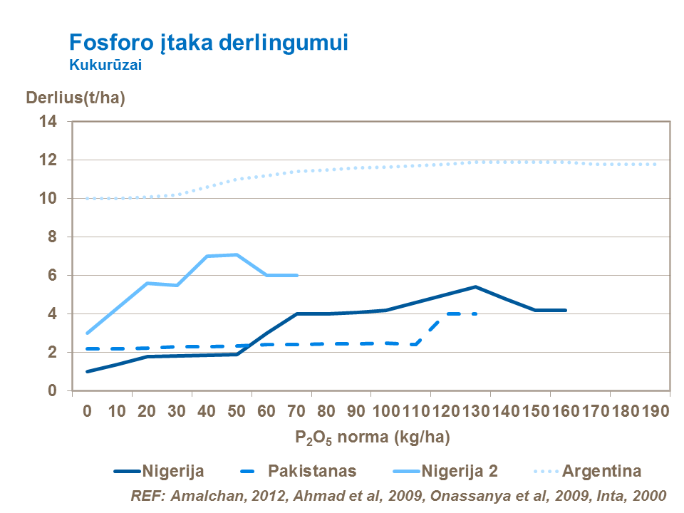Bandymai patvirtino, kad dirvožemiuose, kuriuose nustatomas nedidelis fosforo (P) išteklių indeksas, teigiamą poveikį kukurūzų derlingumui turi tręšimo normos iki 150 kg/ha P2O5. Tačiau, siekiant didelio derliaus, net ir didelį fosforo (P) išteklių indeksą turinčius dirvožemius, rekomenduojama per pirmąjį tręšimą patręšti apytikriai po 20 kg P2O5/ha.