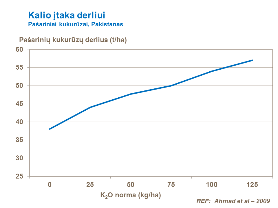 Palyginus su grūdiniais kukurūzais, žymiai daugiau kalio pasišalina iš dirvožemio su pašarinių kukurūzų derliumi (žr.: Kukurūzų mitybos apibendrinimas), todėl būtina į tai atsižvelgti, planuojant kitų pasėlių auginimą tame lauke ir įvertinti tų pasėlių poreikius kaliui.