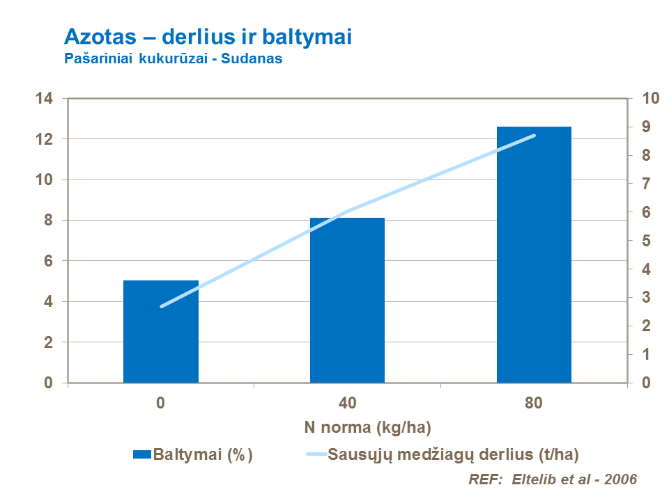 Tręšiant pasėlius azotinėmis trąšomis, galima užsitikrinti didesnį kukurūzų derlių, kadangi azotas padeda suformuoti ir ilgiau išlaikyti kukurūzų pasėlių žalių lapų skliautą, ko pasėkoje efektyviau vyksta fotozintezės procesas ir šviesos spindulių sugėrimas.