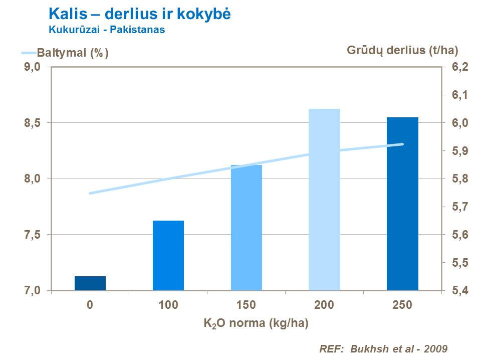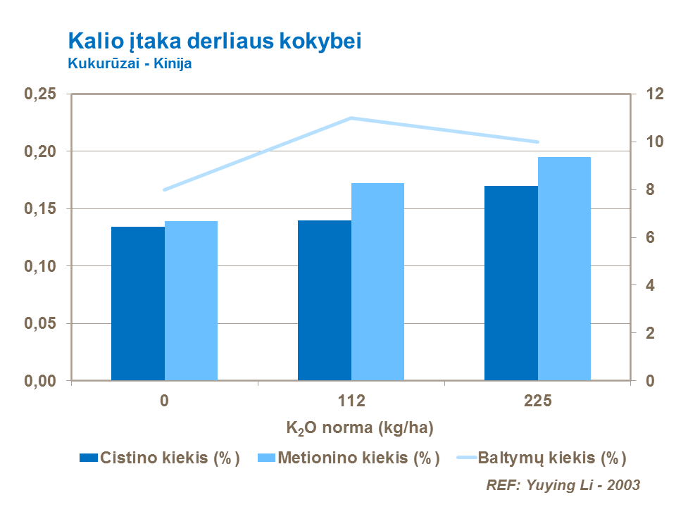 Savalaikis pasėlių tręšimas kalio trąšomis, padidina baltymų kiekį grūduose ir amino rūgščių – cisteino ir metionino koncentraciją.