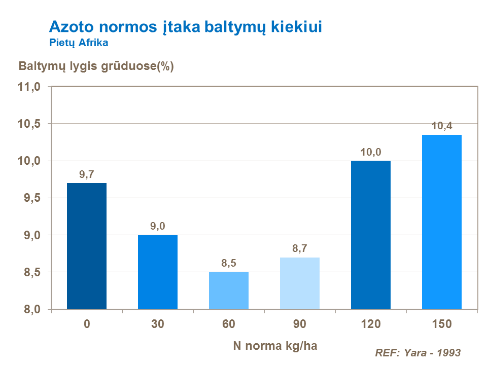 Dėl azoto išteklių stygiaus kukurūzų pasėliams grūdų pildymosi tarpsnyje, gali sumažėti baltymų kiekis grūduose. Tręšiant pasėlius subalansuotomis azotinių trąšų normomis, išbarstant trąšas dirvos paviršiuje stiebo ilgėjimo fazėje, galima padidinti baltymų kiekį grūduose ir tuo pačiu užtikrinti reikiamus azoto išteklius pasėliams grūdų pildymosi tarpsnyje, kai išauga azoto poreikis.