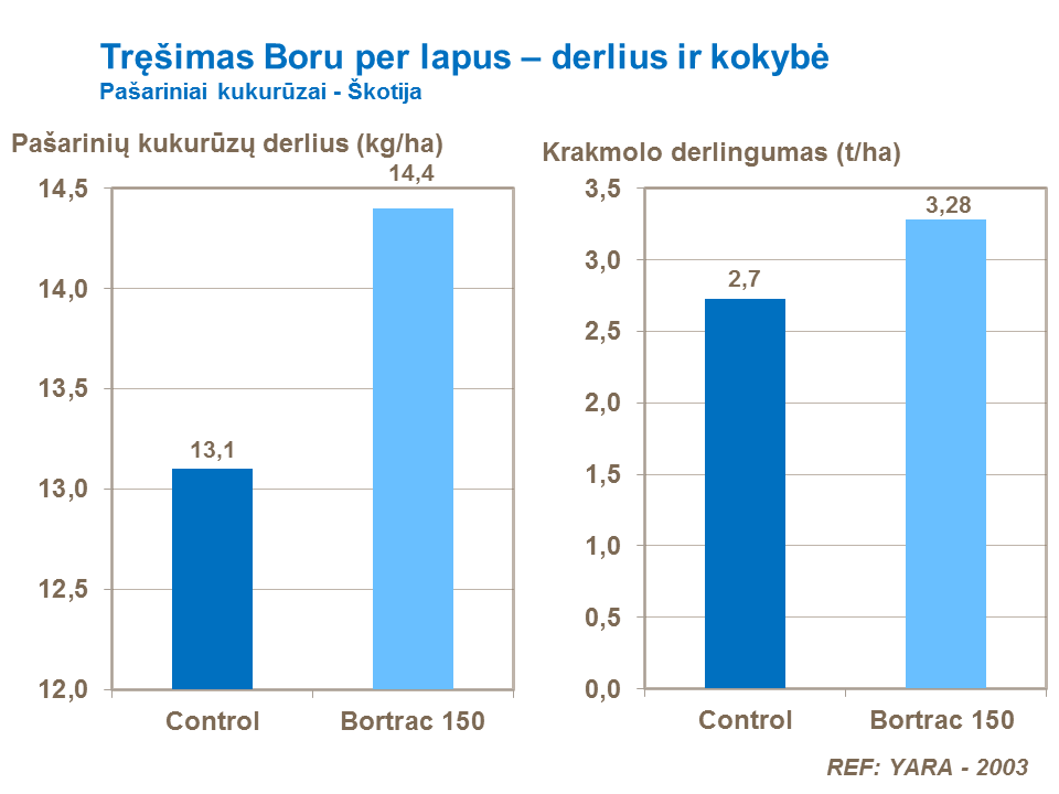 Bandymais patvirtinta, kad boras padidina pašarinių kukurūzų derlių ir krakmolo kiekį žaliojoje kukurūzų masėje. Kai kukurūzų pasėliams trūksta boro, patręšus juos lapų trąšomis su boru V5 ar V6 organogenezės etapuose, kai pilnai išsivystęs lapų skliautas, padidėja pasėlių derlingumas.