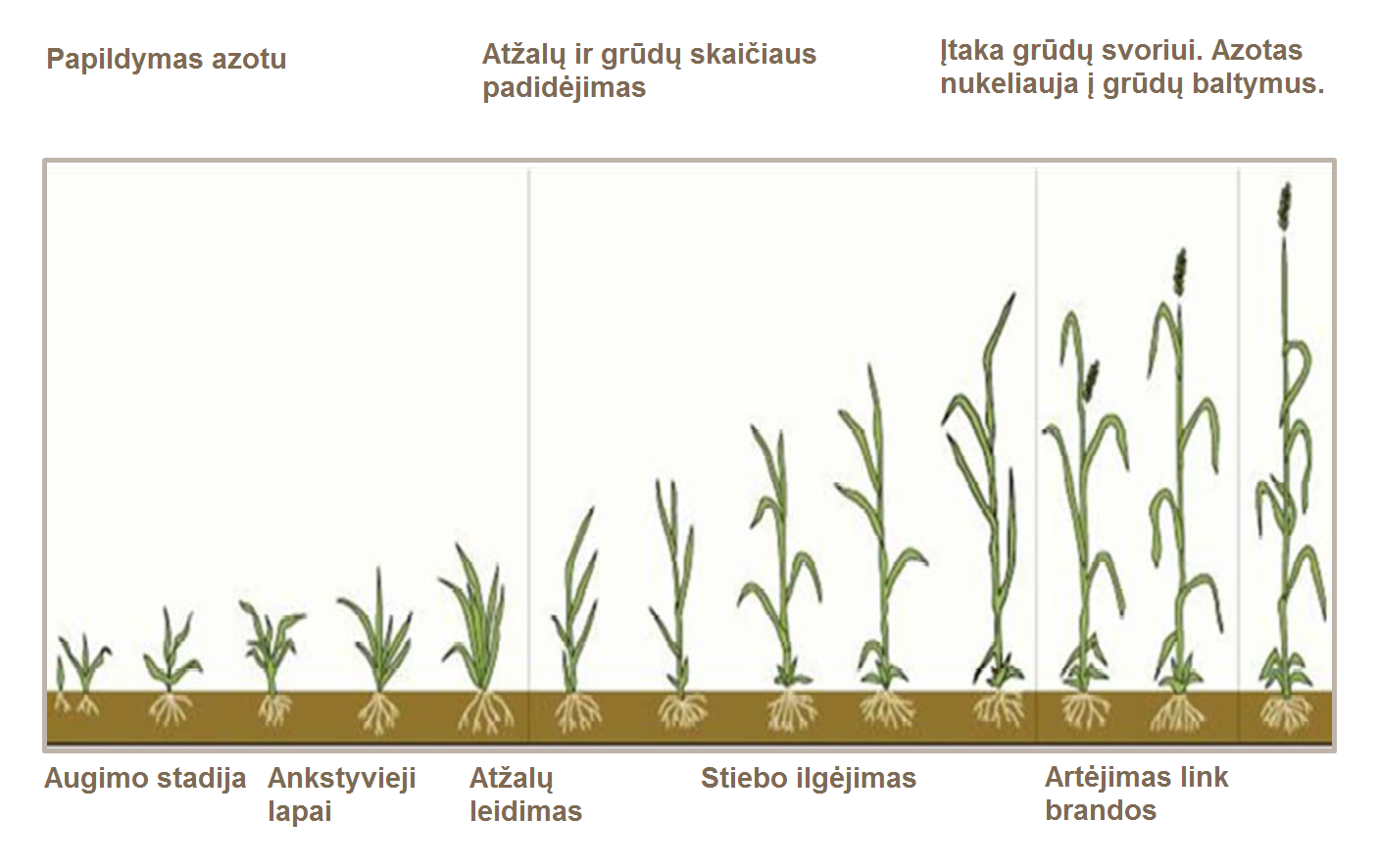 Grūdų baltymų kiekis pašariniuose kviečiuose, esant optimaliam tręšimui N trąšomis, paprastai sudaro apie 11% (tolygu 1,9% N). Duoniniai kviečiai rodo optimalius derliaus rezultatus, kur baltymų kiekis yra apie 12%, todėl, norint pasiekti rinkos rodiklį, viršijantį 13%, dažnai reikia papildomai tręšti azoto trąšomis. Mažas baltymų kiekis grūduose, t.y. mažesnis nei 10% pašarinių kviečių rūšyse, rodo mažesnį už optimalų azoto naudojimą. Svarbus yra ir tręšimo azoto trąšomis laikas. Tręšimas azotu ankstyvoje fazėje (25-32 fazės pagal Zadoksą) paprastai užtikrina didesnį derlingumą, o norint padidinti baltymų kiekį grūduose, azoto trąšas reikia naudoti tarp 37 ir 59 fazės pagal Zadokso skalę. Esant nepakankamam azoto atsargų kiekiui lapų audiniuose, galima imtis korekcinių veiksmų žydėjimo fazėje (70 fazė pagal Zadoksą), tręšiant augalus azoto trąšomis per lapus.