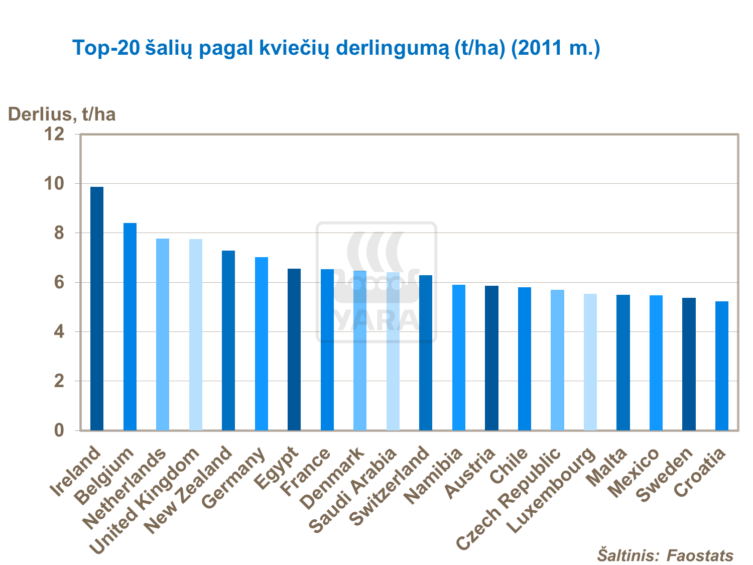 Kviečių vidutiniai derlingumo rodikliai įvairiuose pasaulio žemynuose yra labai skirtingi. Vidutinis Šiaurės ir Centrinės Europos klimatas yra labai palankus dideliam kviečių derlingumui, tuo tarpu žemynai, kuriems būdingos atšiauresnės klimato sąlygos, pavyzdžiui, sausra arba šaltis, yra mažiau palankūs kviečių auginimui. Derlingumo rodiklių diapazonas pakankamai platus: nuo Airijos su 9,86 t/ha vidutiniu rodikliu iki Venesuelos (Venesuelos Bolivaro Respublikos) su vidutiniu 0,31 t/ha rodikliu. Dabartinis pasaulio rekordas, nustatytas Naujojoje Zelandijoje 2010 m. kovo mėn., sudaro 15,64 t/ha. Pasaulio maisto saugumo komitetas pagrindine šiandienos problema laiko tai, kad daugelyje pasaulio šalių derlingumas nedidėja, tuo tarpu planetos gyventojų skaičius nuolat auga ir su kiekviena diena gyventojų aprūpinimo maistu klausimas tampa vis aktualesnis.