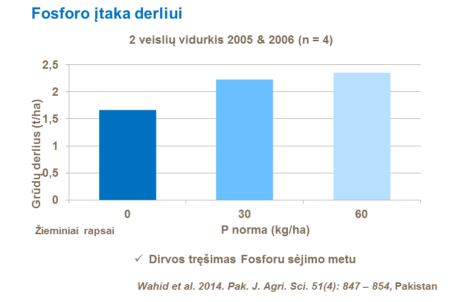 Dauguma dirvožemių palaiko pakankamus forsforo išteklius ir patenkina ankstyvojo periodo poreikį. Vėliau, augimo sezonui įpusėjus, fosforo reikia ankstyvam augalų žydėjimui ir atlieka labai svarbų vaidmenį, nes yra energijos laidininkas, taip pat padeda kaupti ir išsaugoti energiją augalo ląstelėje, todėl svarbu aprūpinti rapsų pasėlius pakankamu fosforo kiekiu pagal augalų poreikį, kad padidėtų aliejaus ir baltymų kiekis sėklose.