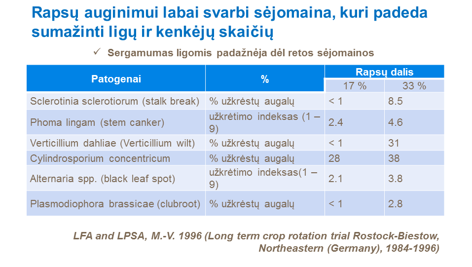 Patogenai kelia grėsmę pasėliams, tačiau riziką dėl šių organizmų galima sumažinti reguliuojant sėjomainą – ilginant sėjomainos laikotarpį. Apsikrėtimo laipsnis žymiai sumažėja, jei sėjomaina taikoma nuo 3 (17%) iki 6 (33%) metų, kaip parodyta šioje lentelėje.