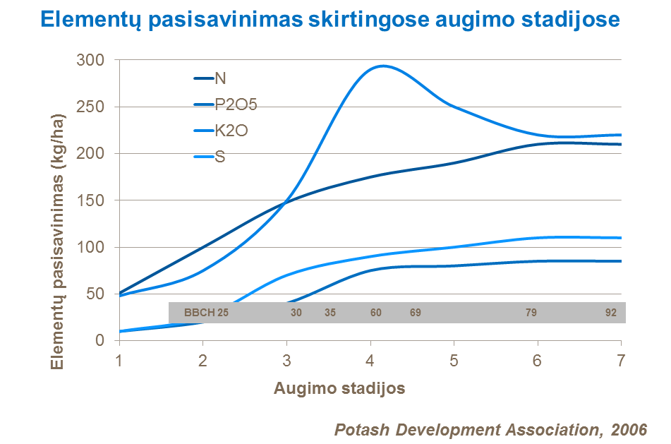 Siekiant užtikrinti optimalų augalo antžeminės dalies susiformavimą pavasarį ir kuo ilgesnį žalių, sveikų lapų išsaugojimą, būtina pasėlius aprūpinti pagrindinėmis maisto medžiagomis, atsižvelgiant į augalų poreikius. Ypač svarbūs mitybos elementai augalams yra azotas (N) ir siera (S), o kol dirvožemis dar šaltas ir drėgnas, fosfatų pasisavinimas gali būti apribotas. Šiuo laikotarpiu didžiausias augalų poreikis būna kaliui (K), kadangi ši maisto medžiaga yra svarbiausia, siekiant išlaikyti antžeminės augalo dalies struktūrą bei formą ir tuo pačiu užtikrinti maisto medžiagų apykaitą visame augale.